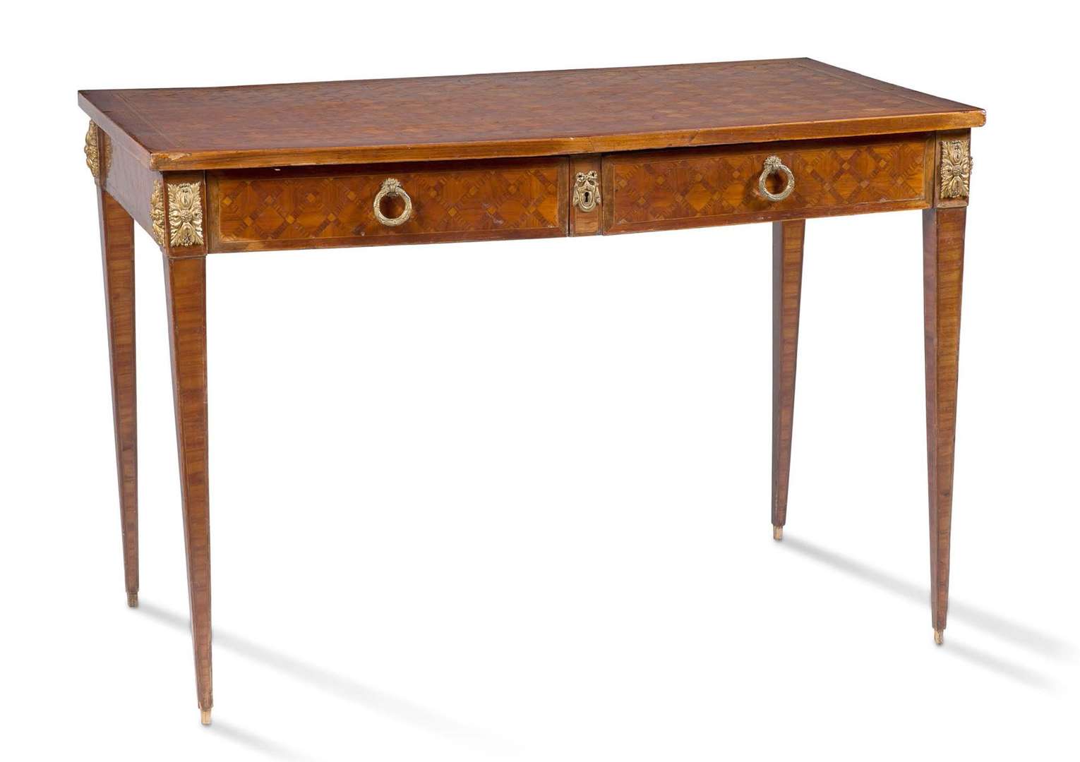 Il ouvre à deux tiroirs en ceinture fermables par une serrure centrale unique à pênes latérales. Quatre pieds fuselés à section carrée. Riches fleurons ciselés et dorés aux dés de raccordement.