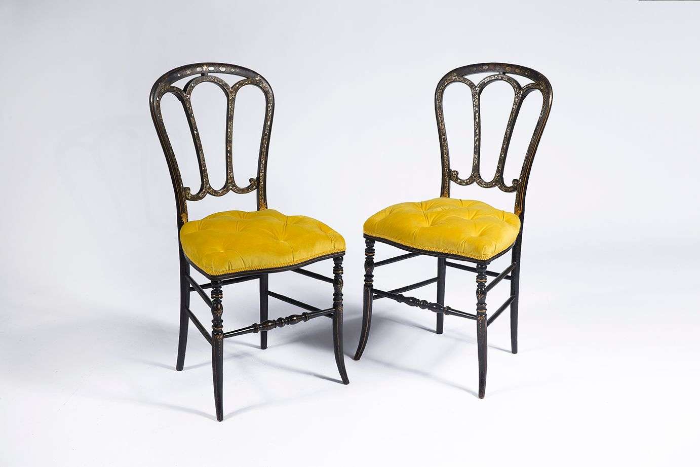 Les dossiers ajourés et les ceintures légèrement arrondies reposant sur des pieds sabres reliés par des entretoises. ~