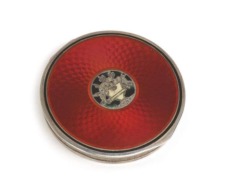 de forme circulaire à décor guilloché. Le boîtier en argent et le couvercle à émail rouge orné en son centre d'une corbeille de fruits.