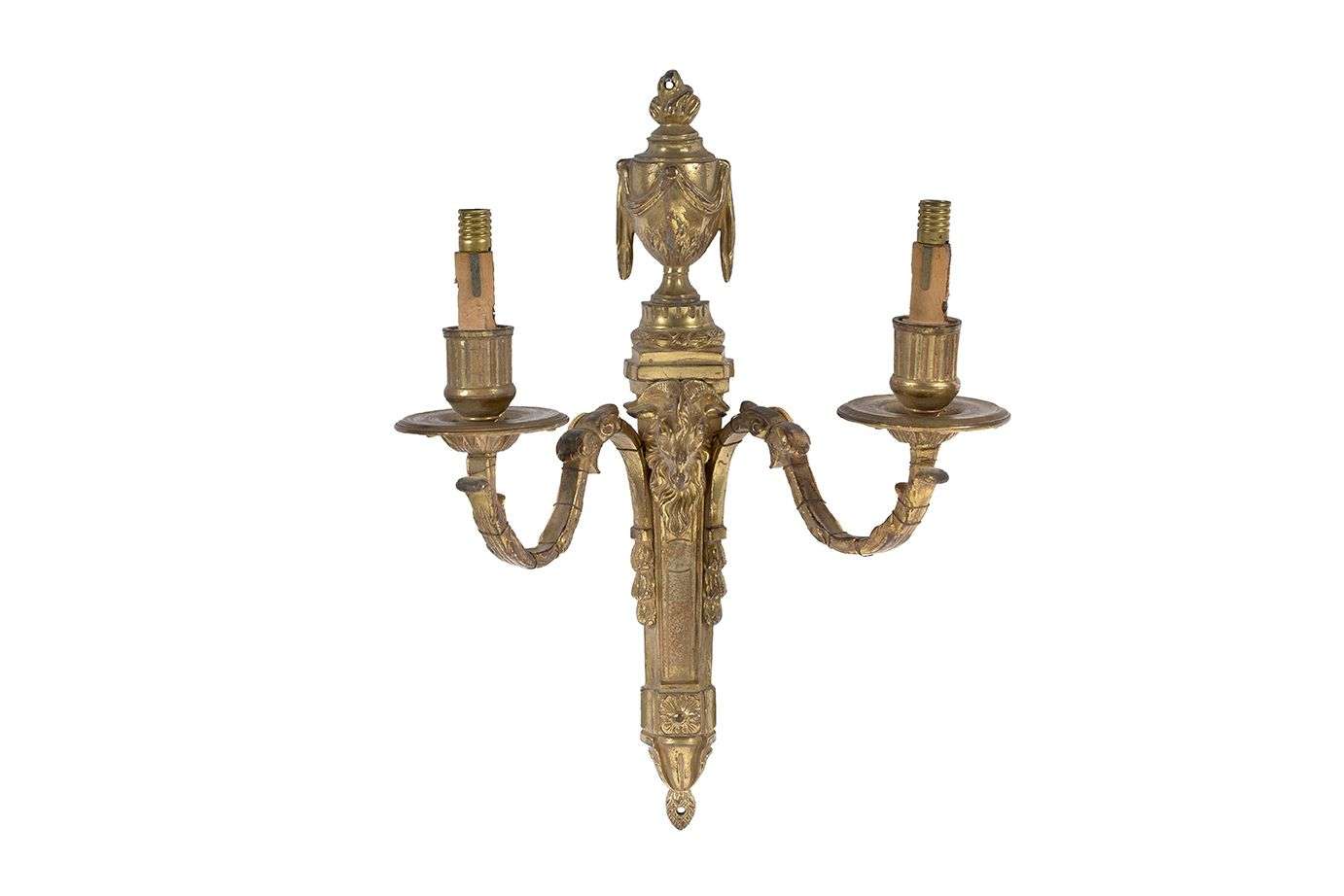 à deux bras de lumière en bronze ciselé et doré, les fûts en gaine ornés d'un visage de bouc et sommés d'un vase couvert à l'antique