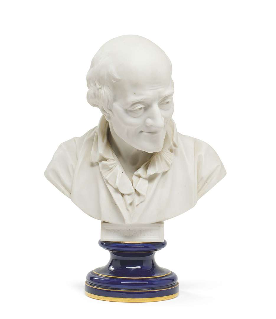 Portrait en buste de Voltaire en biscuit de porcelaine. Le piédouche émaillé bleu et réhaussé à la dorure.