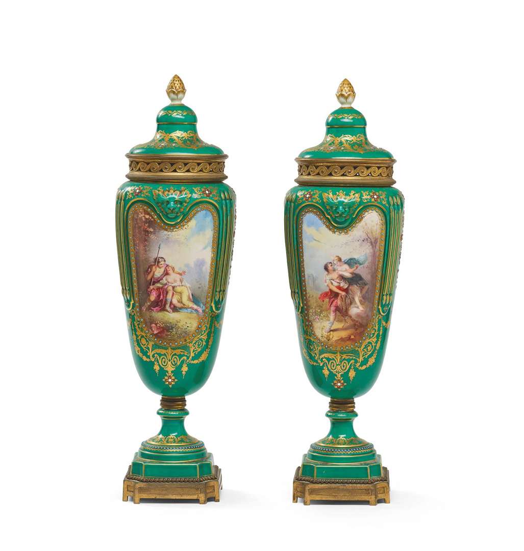 Paire de vases couverts en porcelaine verte et monture en bronze doré, à décor réhaussé à la dorure de motifs stylisés.