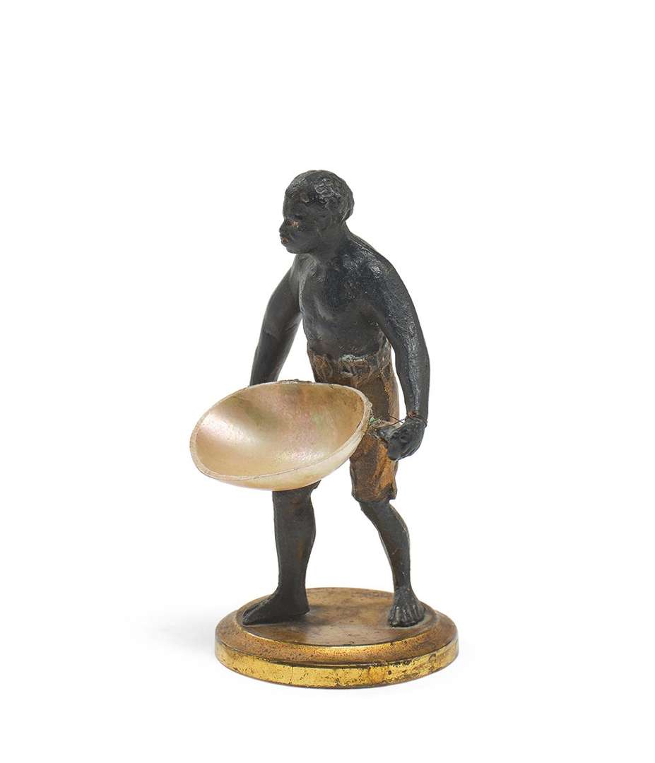 Sujet en alliage cuivreux et patiné noir . Le panier en nacre.