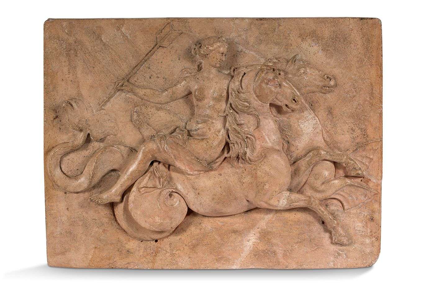 En plâtre patiné, à décor d'une nymphe sur deux chevaux marins dans le goût de l'Antique.