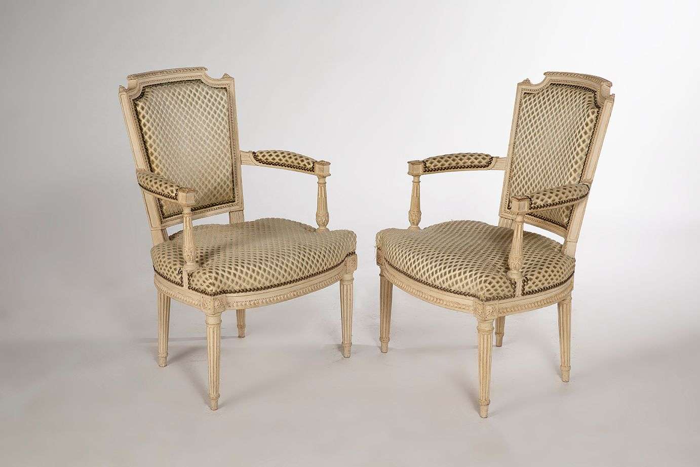 Les consoles d'accotoirs en retrait et les pieds fuselés et cannelés.