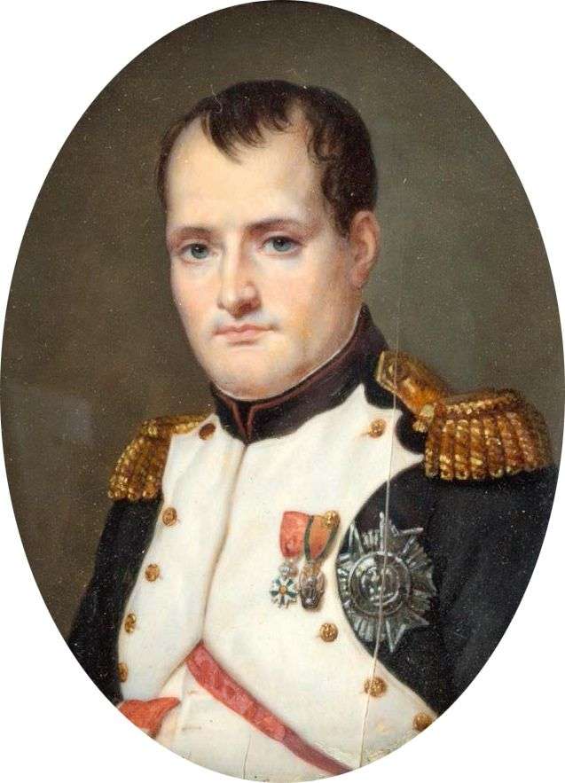 Napoléon Ier en uniforme portant la Grand-Croix de la Légion d'honneur, sa croix de la Légion d'honneur et son insigne de la Couronne de fer. Fond uni gris. Signé à gauche : «Chabanne».