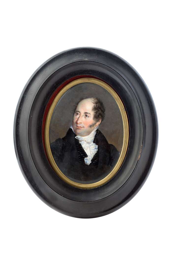 Grande miniature ovale, portrait d'un bourgeois en redingote noire, gilet à rayures et cravate blanche.