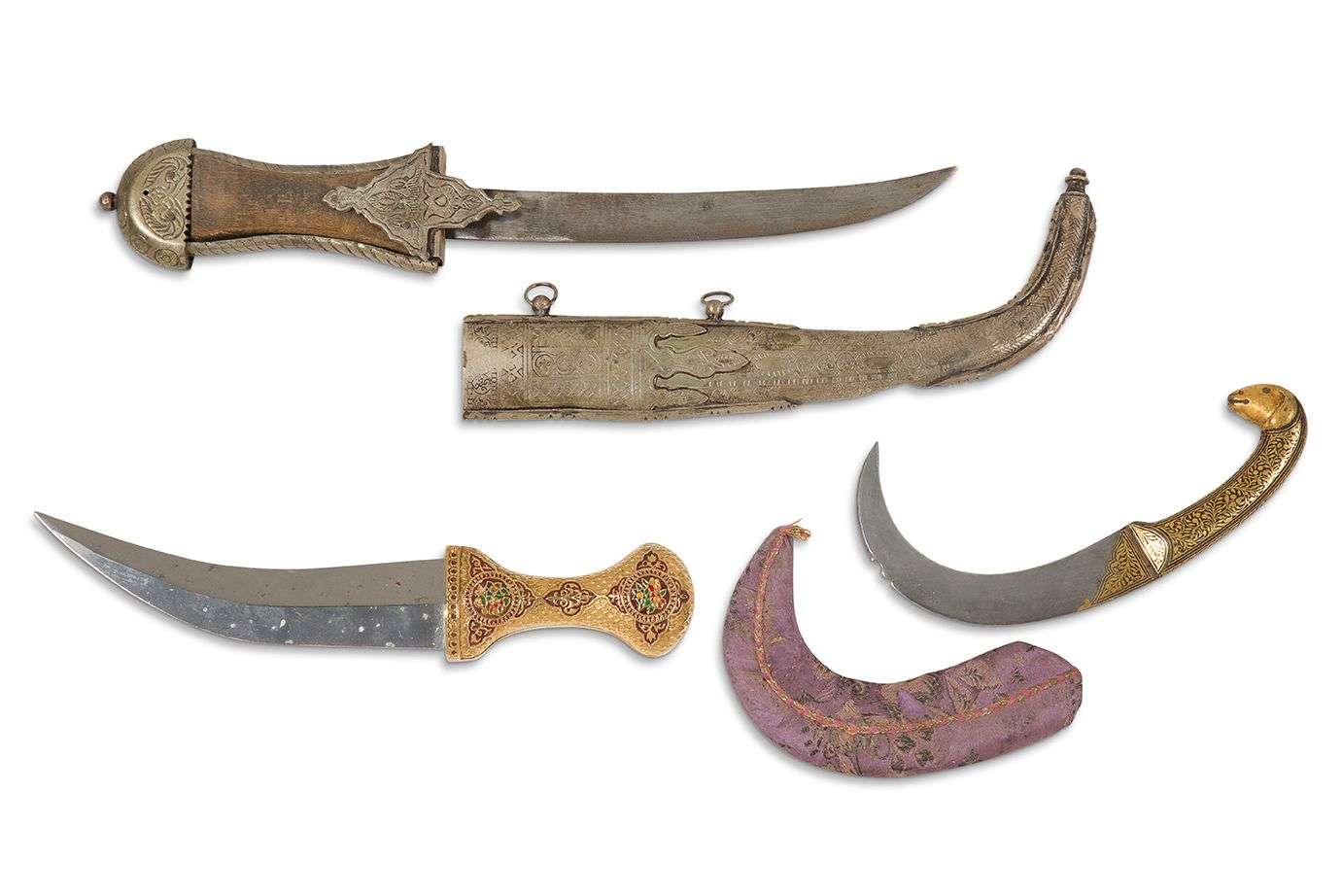 dont deux Jambiya à manches en laiton et un Koumia à manche en bois et alliage cuivreux.