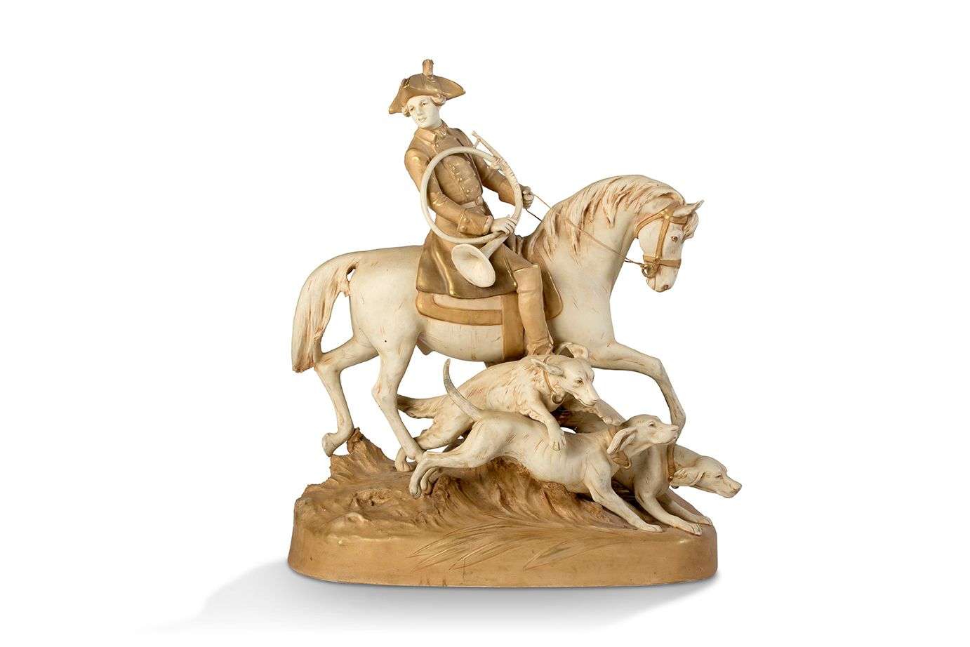 Groupe représentant un cavalier et ses chiens en céramique peinte crème et verte. Sous la base le cachet triangulaire rose de la manufacture Royal Dux Bohemia.