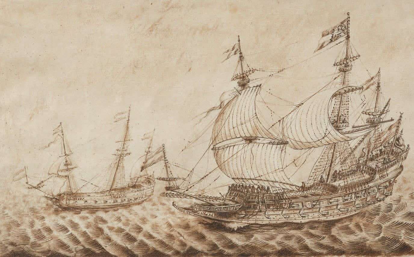 Two galleys at sea, pen, China ink and brown wash