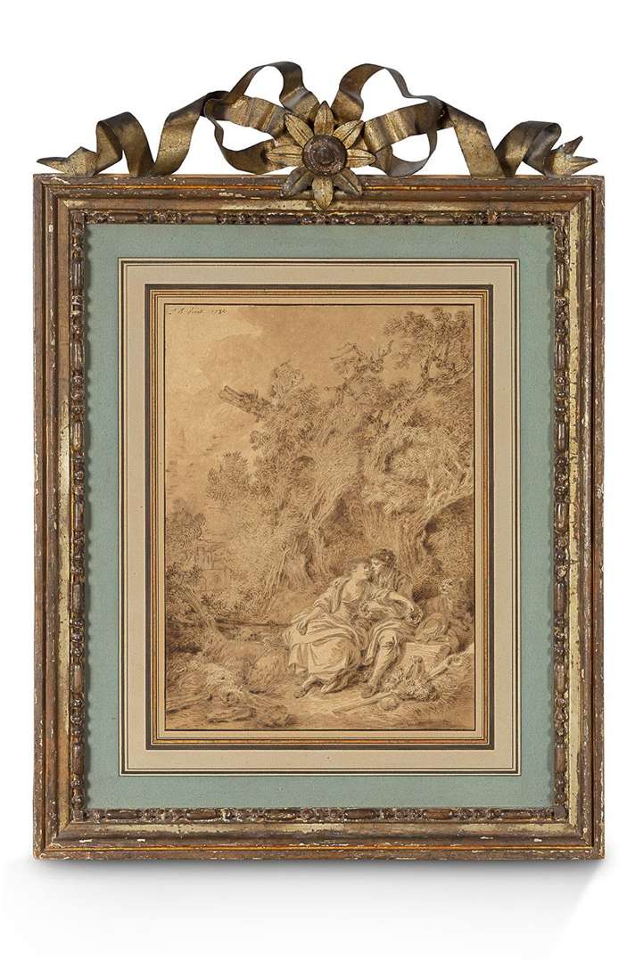 Fils d'un peintre du garde-meuble du roi, Jean-Baptiste Huet naît au Louvre en 1745. Issu d'une dynastie d'artistes, c'est naturellement qu'il se forme et développe sa manière dans un contexte aussi familier que favorable. D'abord élève de son père, il entre ensuite dans les ateliers du peintre animalier Charles Dagomer (c. 1700-1766) puis de Jean-Baptiste Le Prince (1734-1781), élève parmi les plus éminents de François Boucher (1703-1770). Nourri de ces premières influences, Huet puise également son inspiration chez les maîtres italiens et flamands de la Renaissance au baroque. Rapidement, il développe une appétence toute particulière pour les pastorales et les sujets animaliers, genres dans lesquels il excelle et se voit sollicité régulièrement, jusqu'à les transposer aux arts décoratifs. Christophe-Philippe Oberkampf (1738-1815) lui commande notamment des motifs pour les toiles imprimes de Jouy, motifs toujours diffusés à l'heure actuelle. Reçu à l'Académie royale de peinture et de sculpture en 1769, iil est régulièrement présent au Salon de 1769 à 1802.A la suite de Boucher, Huet se fait aussi le chantre de ce XVIIIe siècle badin et quelque peu insouciant. Cette jolie scène galante en témoigne : évitant l'écueil de la mièvrerie, l'artiste mêle à la légèreté de l'instant un aspect plus licencieux. Sur fond de paysage idéalement bucolique, un couple de bergers se repose parmi son troupeau couché. Si le geste perçu au premier abord est celui de l'échange des couronnes de fleurs, il ne doit omettre ni le geste du berger dévoilant la poitrine de sa compagne, ni l'attitude visiblement mécontente du chien qui y assiste. N'en déplaise à ce dernier, l'issue de l'instant est scellée. Jouant avec les codes du badinage, Huet nous offre cette vision idéalisée d'une vie rustique mais épanouissante au cœur d'une nature harmonieuse.