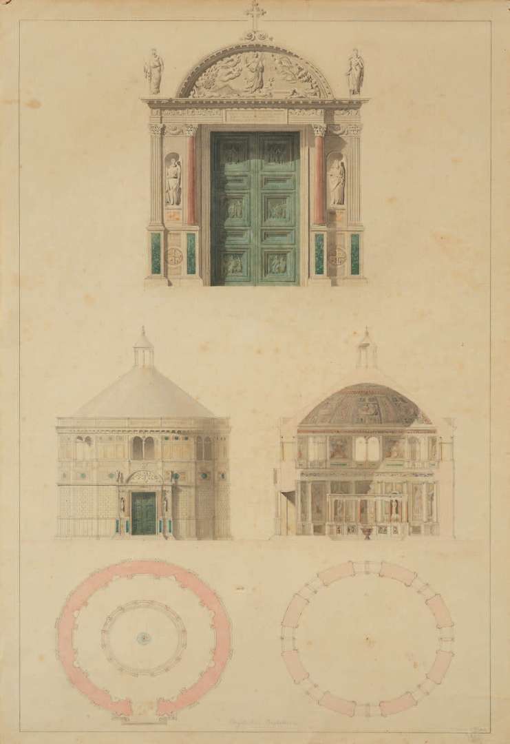 Projet ou relevé de baptistère (élévation, coupe plan et détail de la porte)