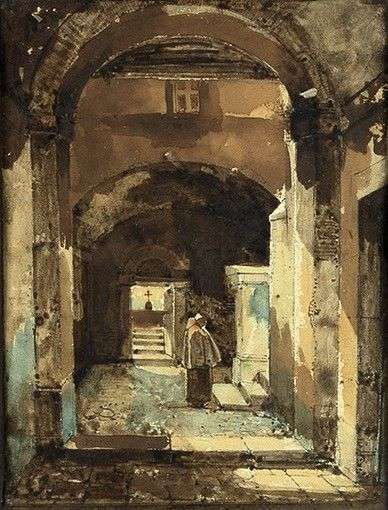 Monk through an arch, watercolor, pen and brown ink, black chalk, signed lower left