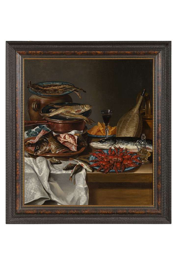 Nature morte aux poissons de rivière, verre de vin, fiasque et écrevisses