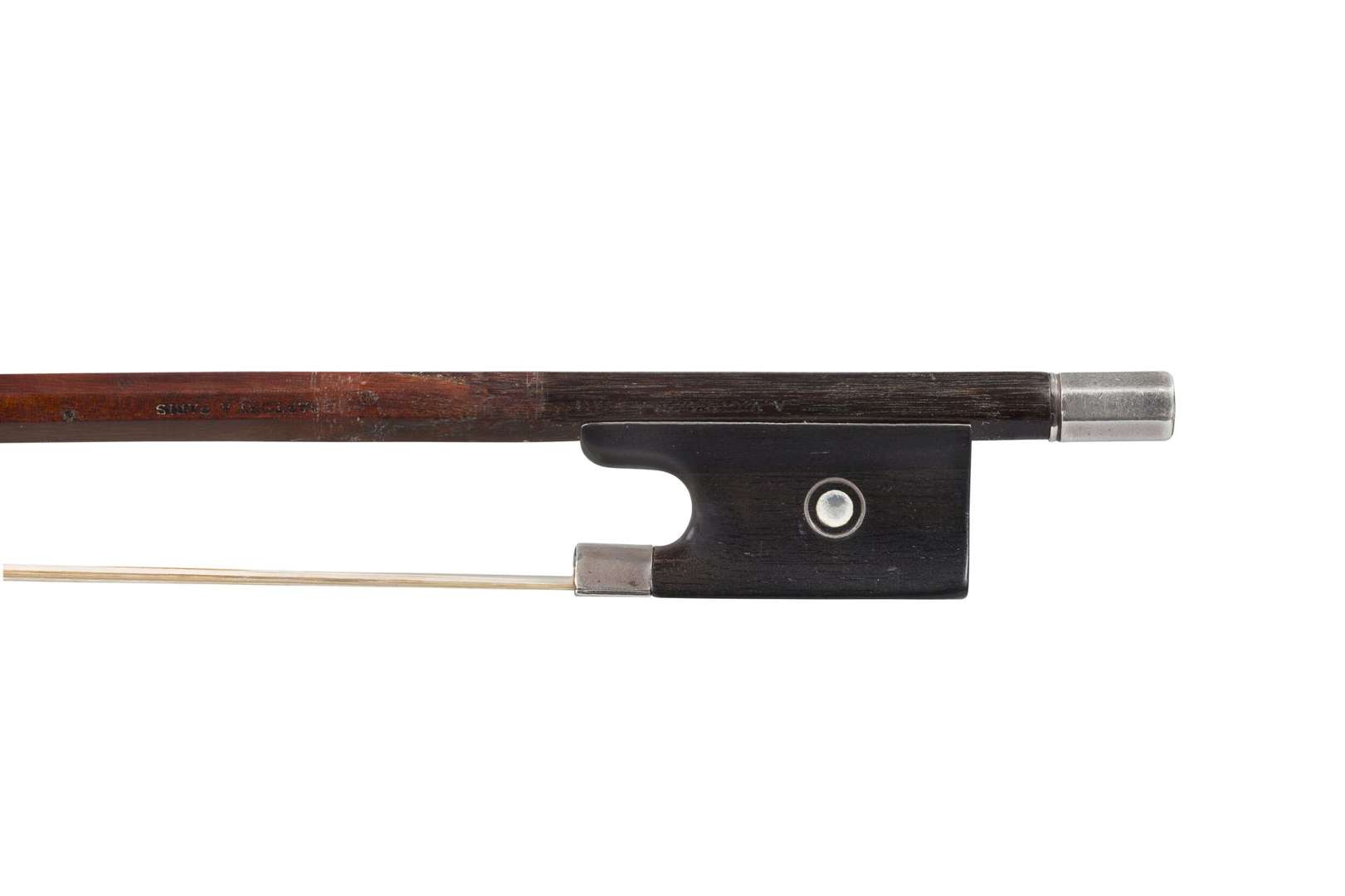 A French Silver-Mounted Violin BowThe restored Stick and Frog by Eugène Sartory Restoration under lapping with a grafted handle by Joseph Arthur Vigneron père, the Silver Button from the same period