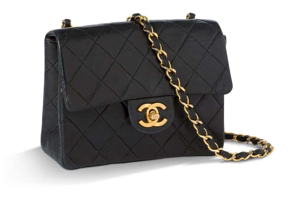 Petit sac en cuir matelassé noir et garniture en métal doré.