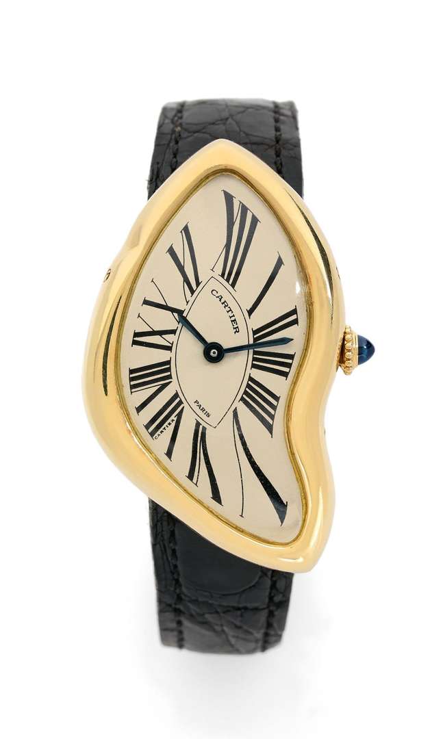Cadran : patiné avec index chiffres romains également déformés épousant la forme du boîtier, signé