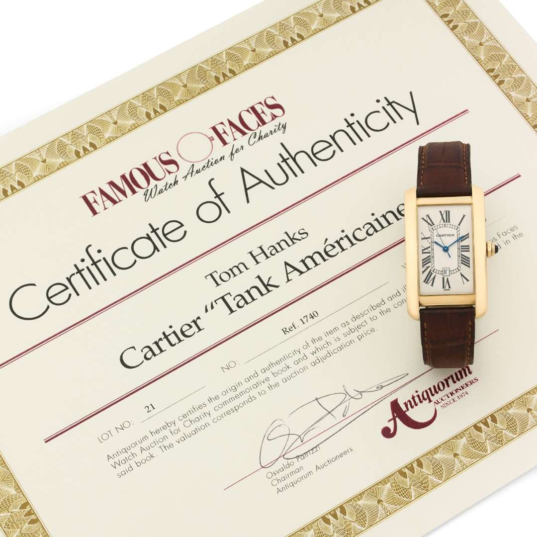 Cette montre a été donnée par l'acteur américain avec le soutien de la maison Cartier pour soutenir de nombreuses associations caritatives au travers d'une vente historique ayant rassemblé de nombreuses célébrités à New York le 24 février 1999. Le 24 février 1999, Antiquorum a organisé la « Famous Faces, Watch Auction For Charity » à Tourneau, à New York. Cet événement a présenté des montres offertes par des personnalités célèbres, dont les bénéfices ont été reversés à diverses organisations caritatives. La vente aux enchères a permis de récolter des fonds pour diverses causes caritatives, démontrant ainsi l'esprit philanthropique des célébrités participantes telles que Tom Hanks dont la montre fut vendue sous le lot 21 du catalogue de l'époque. Parmi les célébrités américaines, on retrouvait notamment les acteurs Leonardo Di Caprio, Liz Taylor, Dustin Hoffman, Robert Redford ou encore Paul Newman.