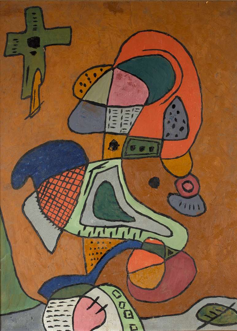 Dans notre oeuvre de 1950, Chaissac se distingue par l’emploi de couleurs vives et contrastées, insufflant une énergie dynamique à la composition. Les formes géométriques, délimitées par d’épais cernes noirs, instaurent une tension entre la rigueur du trait et la fluidité des couleurs. Présentée lors de la rétrospective de 1990 au Musée Campredon, cette oeuvre s’inscrit dans une série explorant l’essence de l’art populaire. Cette exposition, qui retraçait l’évolution de son travail, a permis de révéler toute la richesse de son univers pictural, empreint d’humour, de spontanéité et d’une poésie naïve. À travers son art, Chaissac s’affranchit des conventions, traduisant une vision du monde foisonnante d’énergie et de fantaisie.