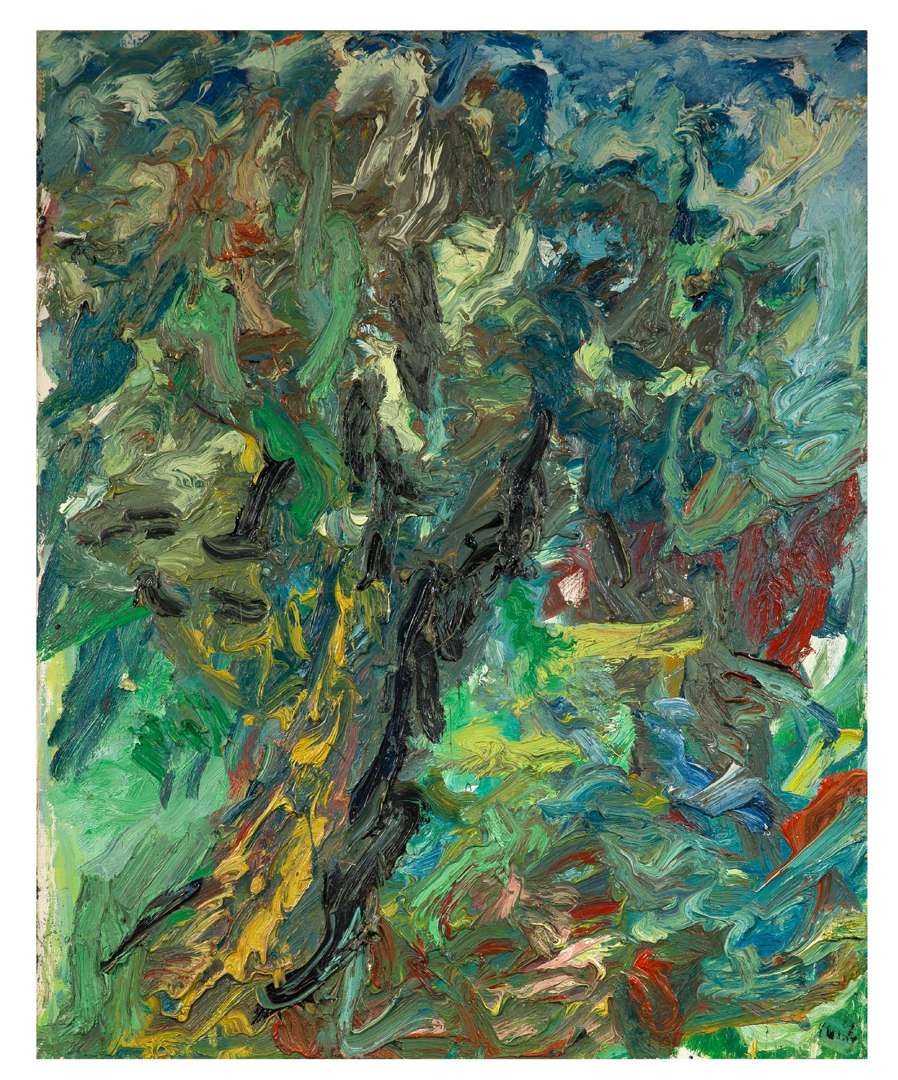 Parmi les présentes oeuvres, cette grande huile sur toile illustre parfaitement l’approche picturale si caractéristique d’Eugène Leroy. La matière picturale est déposée en couches épaisses, quasi sculpturales, où les touches de vert, de bleu et d’ocre s’entrelacent dans un enchevêtrement organique et vibrant. Le sujet, souvent à la limite de l’abstraction, semble émerger lentement du chaos. Les empâtements confèrent à l’oeuvre une densité matérielle rare.