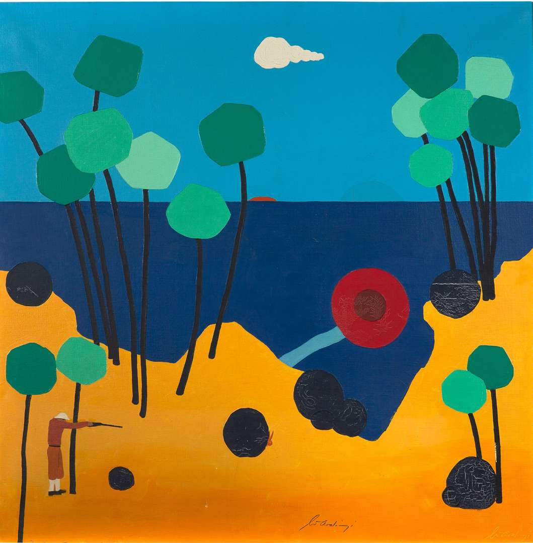 Willy Aractingi is a Franco-Lebanese artist born in 1930 in NYC, whose work draws inspiration from the landscapes, myths, and cultures of the Mediterranean basin. At the crossroads of Eastern and Western influences, his art is characterized by stylized forms, vibrant colors, and narratives often imbued with mystery. His work, both figurative and symbolic, merges memory and imagination to create scenes that oscillate between dream and reality. In Libanais veut dire chasseur, Aractingi presents a refined, almost dreamlike vision of a sunlit coastline. The deep blue of the sea contrasts with the radiant ochre of the sand, structuring the composition into large, bold color fields. The trees, reduced to geometric shapes suspended on thin black stems, evoke a reimagined nature simplified to the extreme yet still recognizable. This stylization gives the work a distinct modernity, recalling influences from naïve art and Oriental miniatures while remaining deeply personal.
