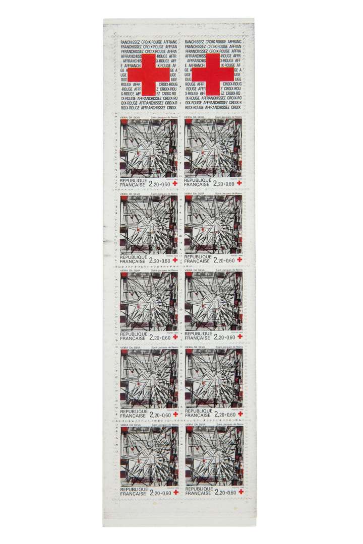 Carnet de 10 timbres-poste datants de 1986 illustrant un détail du vitrail de l'église Saint Jacques de Reims. Au profit de la Croix-Rouge française