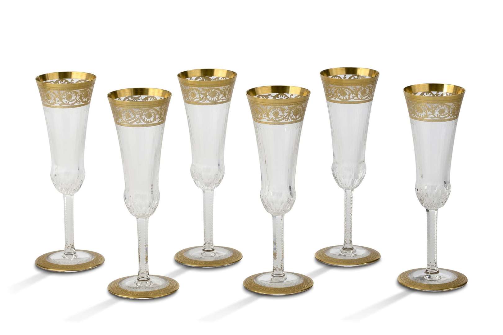 Suite de six flûtes à champagne, modèle ‘Thistle’ en verre translucide à décor rehaussé