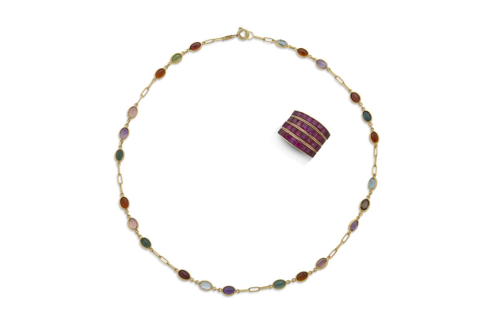 - Ensemble, bracelelet et collier. Pierres fines colorées et or 18k (750). L. : 18 et 39 cm env. - Pb. : 11.4 g