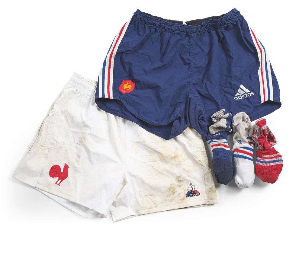 Portés en match pour l'Équipe de France. On y ajoute 3 paires de chaussettes, bleues, blanches et rouges portées en match. Années et joueurs à déterminer.