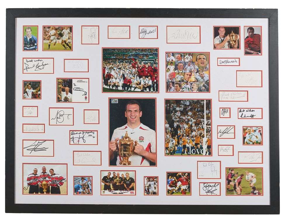 Présentant les photographies et signatures de tous les joueurs anglais champions du monde de 2003 dont Martin Johnson et Jonny Wilkinson.