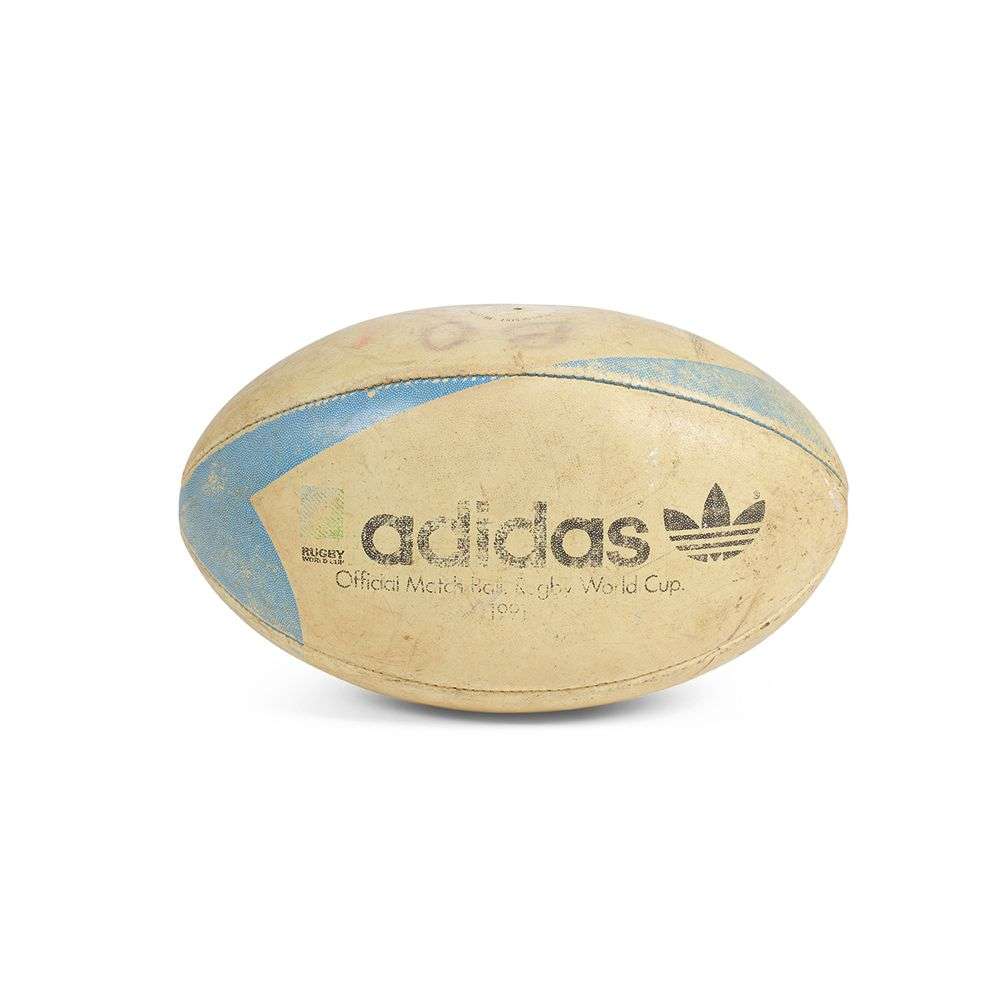 Utilisé pour une rencontre du Japon lors de la Coupe du Monde de rugby 1991 en France. Traces du terrain et usure sur le ballon.
