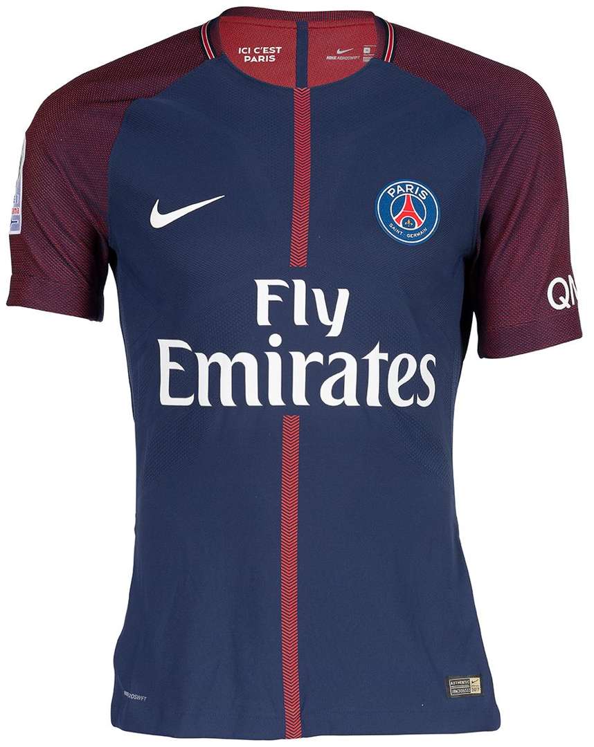 Porté pour le Paris Saint-Germain en Ligue 1 lors du match Paris Saint-Germain - Strasbourg, saison 2017 - 2018, deuxième mi-temps.