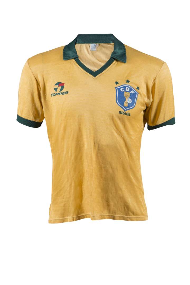 Maillot n°17 du Brésil porté pour l'équipe nationale du Brésil lors du 8e de finale de la Coupe du Monde 1986 contre l'Espagne, le 1er juin 1986 au stade de Guadalajara (1-0). Branco compte 72 sélections pour 9 buts en équipe du Brésil. Marque Topper. Certifcat d'authenticité (COA) sur demande.