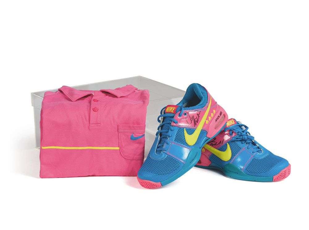 Préparées pour les demi-finales de Roland Garros 2009 pour Rafael Nadal, non portées car éliminé en 1/8 de finale (modèle Air Max Courtballistec 1.3 semelle terre-battue). Les chaussures sont signées. On y joint le polo modèle boutique por