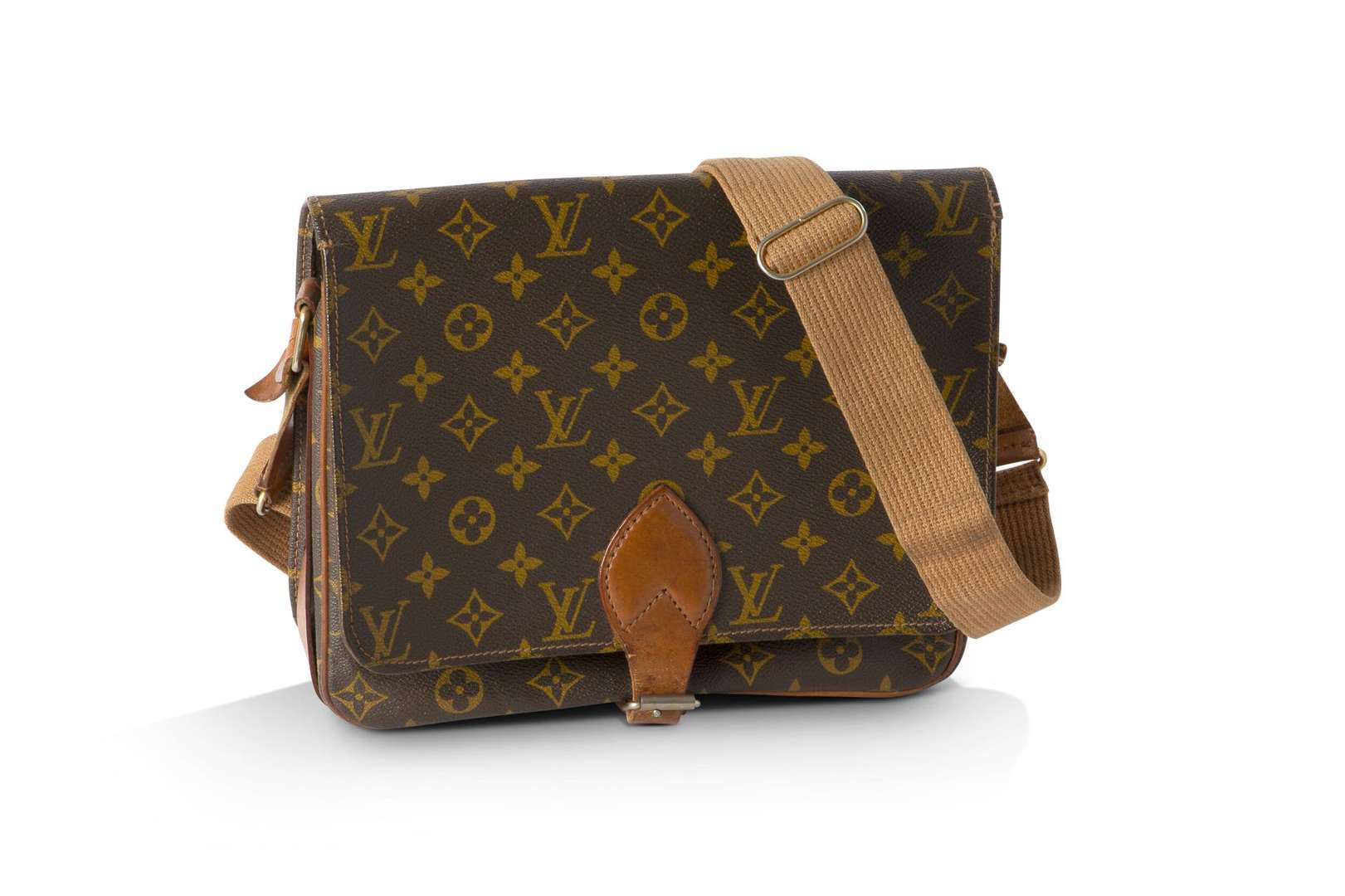 Sac en toile monogrammée et cuir naturel avce garniture en métal.