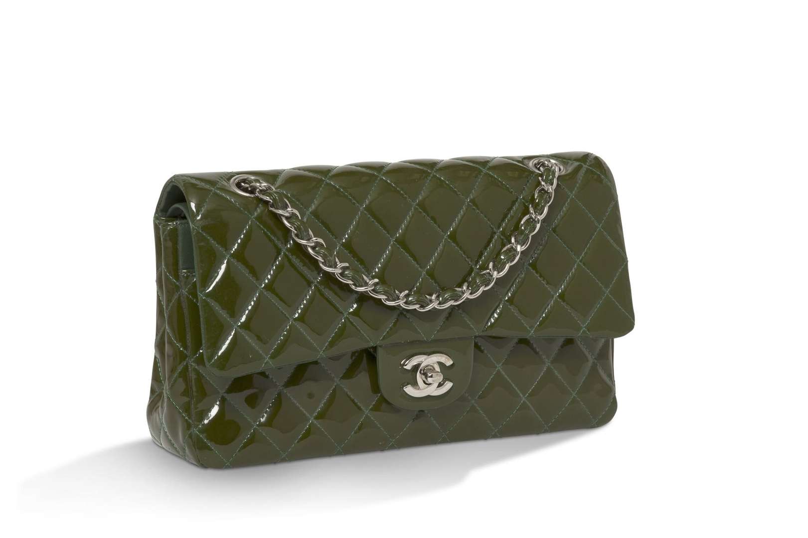Sac matelassé en cuir verni vert et garniture en métal argenté. Double anse-chaîne enrelacée de cuir, ajustable.