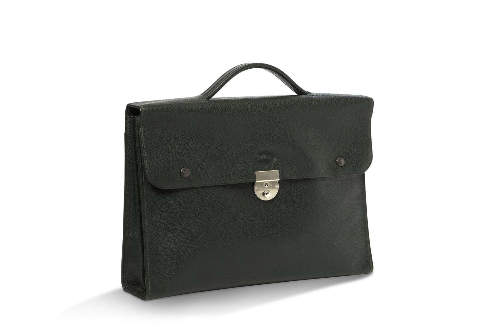 Sacoche en cuir grainé vert avec garniture en métal argenté et poignée en cuir.