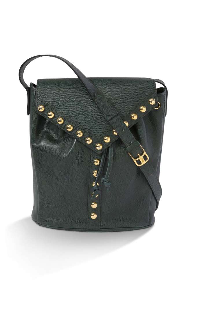 Sac en cuir vert avec garniture en métal doré. Bandoulière réglable en cuir.