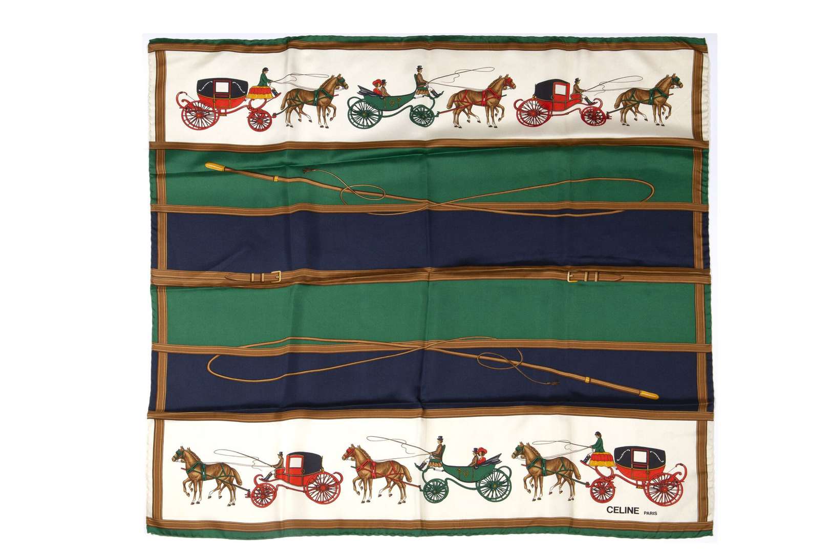 Carré de soie à décor de calèches, dans les tons de vert et de marron.