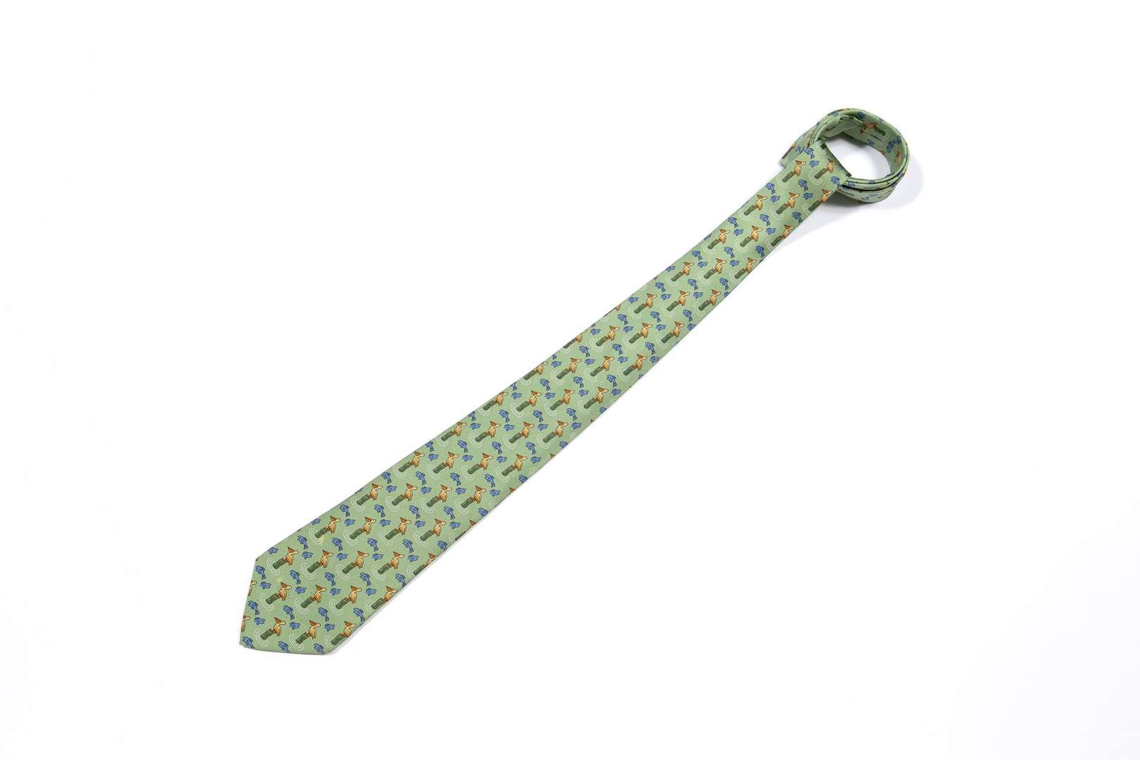 Cravate "Pélicans et poissons" en soie dans les tons de vert et bleu.