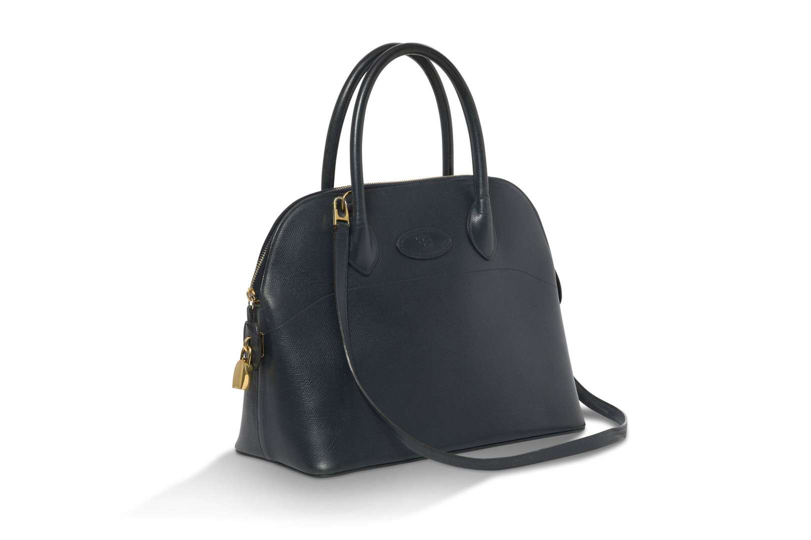 Sac en cuir grainé bleu pétrole avec garniture en métal doré. Double poignée et bandoulière amovible.