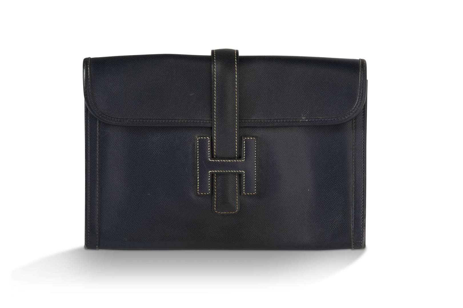 Pochette en cuir grainé marine à surpiqures blanches.