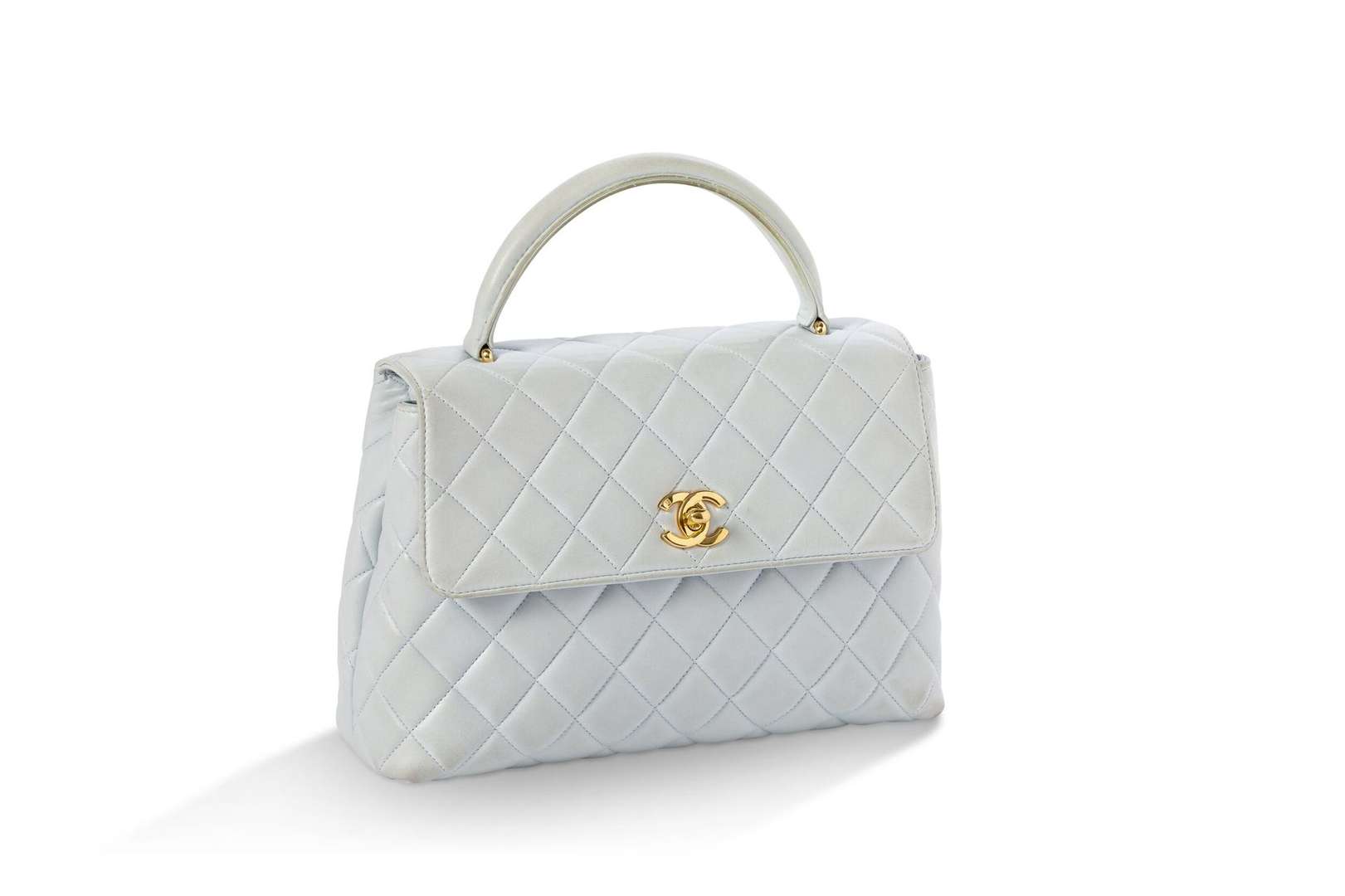 Sac en cuir matelassé bleu ciel avec garniture en métal doré. Poignée en cuir.