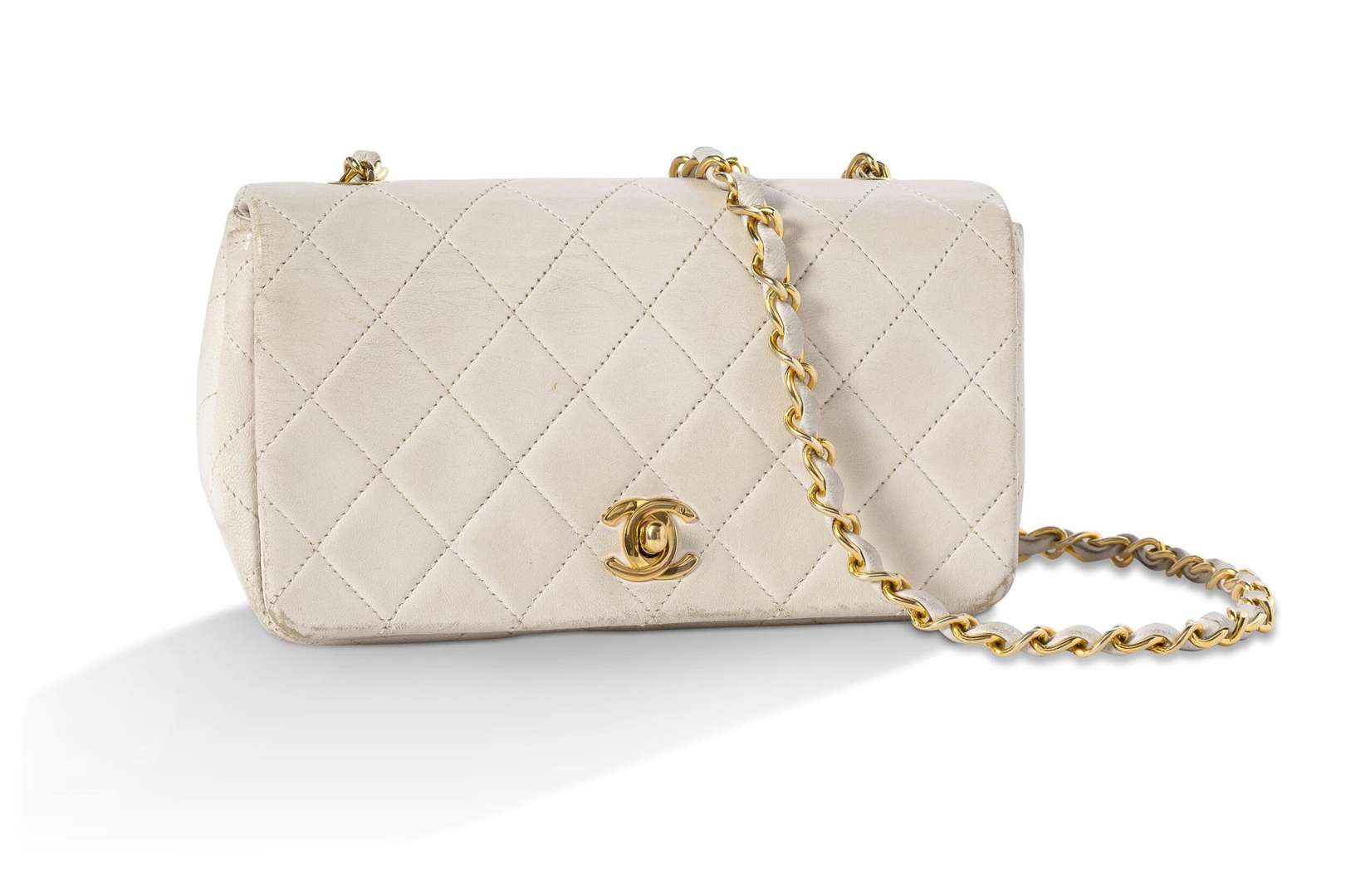 Sac du soir en cuir matelassé crème avec garniture en métal doré. Anse-chaine entrelacée de cuir, amovible.