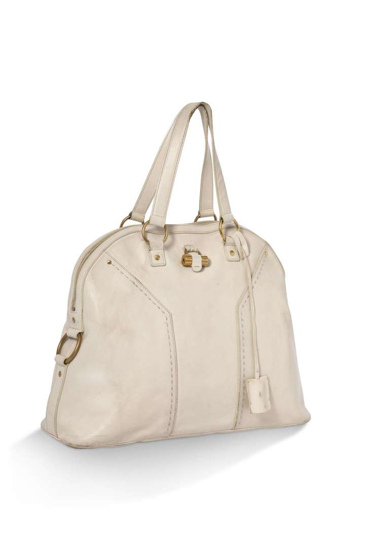 Sac cabas en cuir blanc avec garniture en métal doré. double anse en cuir.