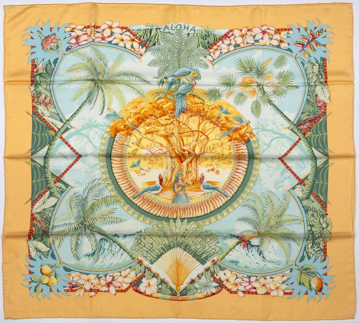 Carré de soie dessiné par Laurence Toutsy Bourthoumieux, dans les tons jaune, bleu et vert.