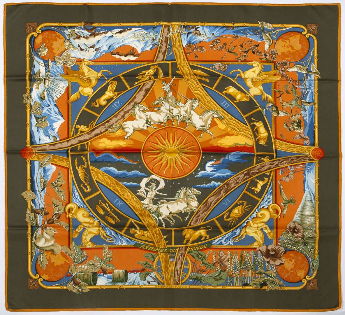 Carré de soie déssiné par Laurence Toutsy Bouthoumieux dans les tons ocre et orange.