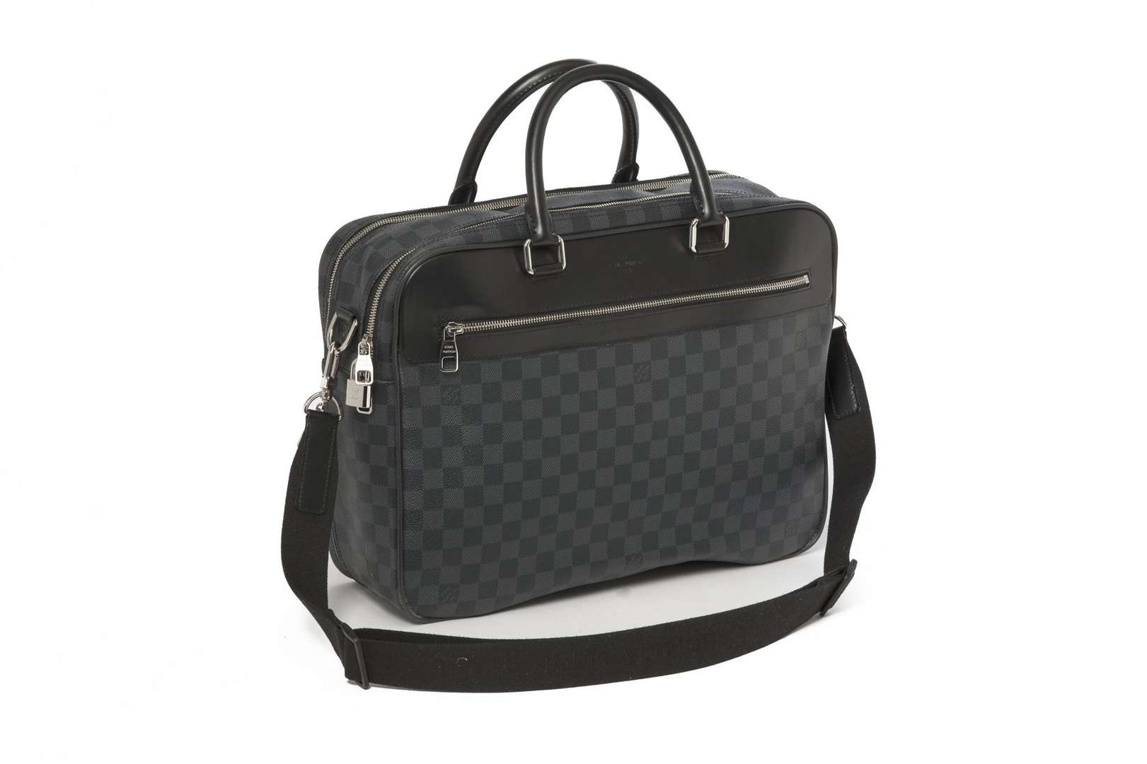 Sacoche en toile damier graphite et cuir noir avec garniture en métal argenté. Poche plaquée zippée sur le devant. Double poignée en cuir noir et bandoulière en toile amovible et ajustable.