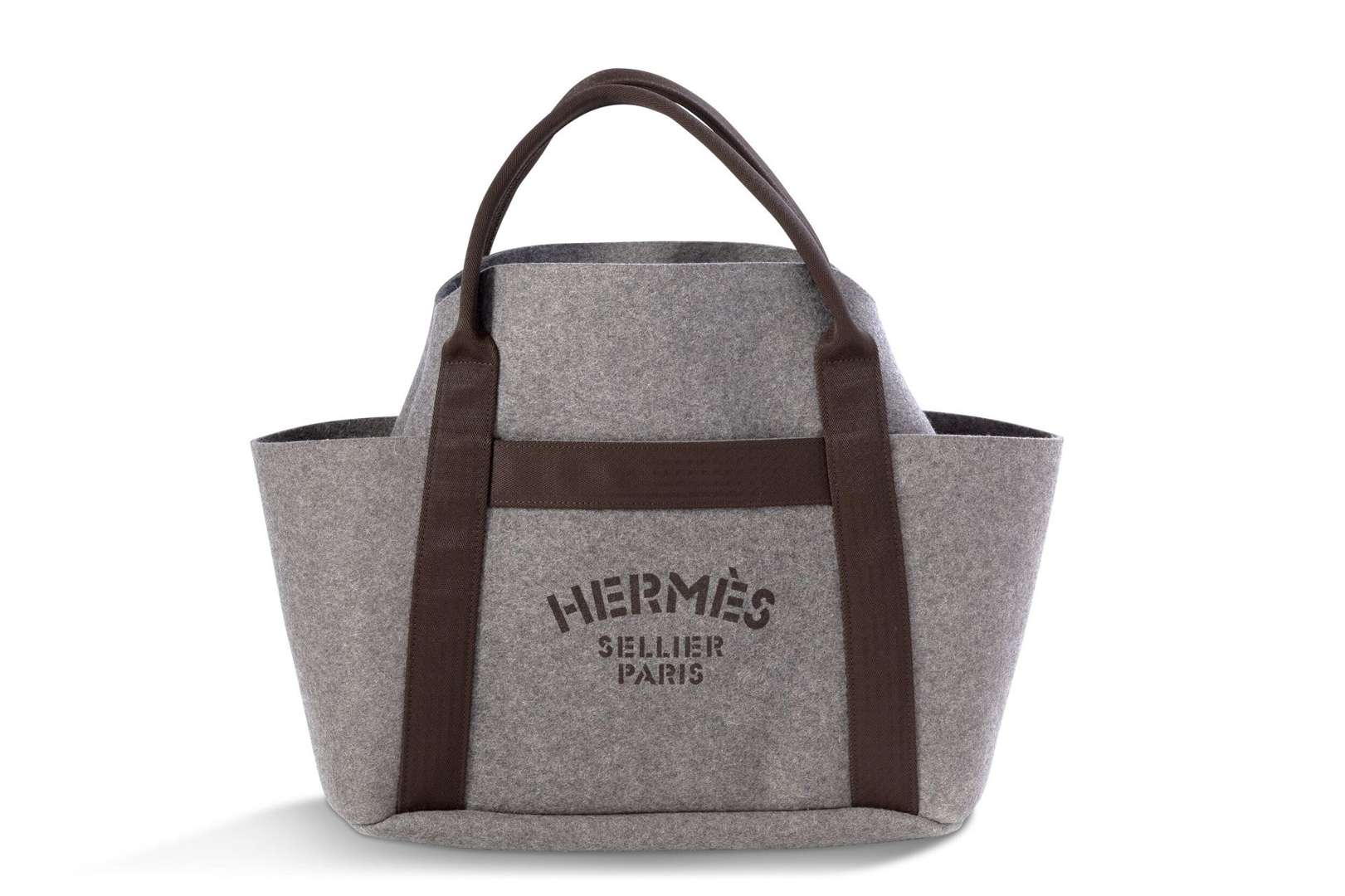Sac de Pansage Groom en feutre gris et toile marron. Double poignée en toile et anse bandoulière amovible.