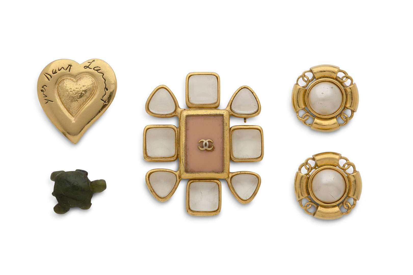 - SAINT LAURENT Broche "Coeur" en métal doré. H. : 4.3 cm env. Signée
